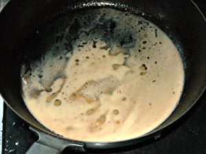 ⑧フライパンにバターを溶かし、醤油を加えて良く混ぜ、ソースを作ります。