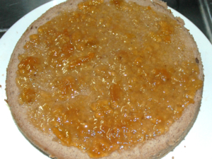 ![]() ⑬ケーキの粗熱が取れたら、横半分に切り、温めたアプリコットジャムを塗り広げ、もう一枚のケーキで蓋をします。 |