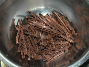 ![]() ⑭ボールに細かく均一に刻んだブラックチョコを入れます。 ⑮小鍋に生クリームとラム酒を入れ、沸騰寸前まで温めておきましょう。 |