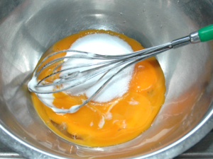 ![]() ③卵黄のボールに砂糖を入れ、白っぽくもったりするまで泡立てます。 |