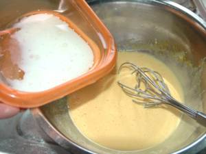 ![]() ④牛乳とサラダ油を一緒に耐熱容器に入れ、レンジで20秒程温め、人肌になったら、卵黄のボールに少しずつ加えながら混ぜましょう。 |