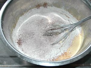 ![]() ⑥卵黄のボールに薄力粉とココアを一緒に振い入れ、良く混ぜ合わせましょう。 |
