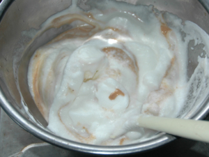 ![]() ⑤卵黄のボールにメレンゲを少量入れて、良く混ぜ合わせます。 |