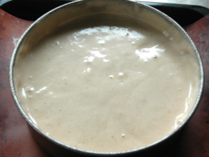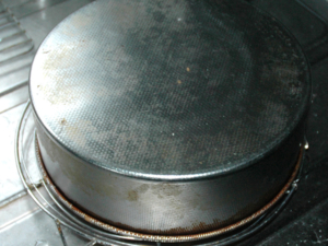 ![]() ⑪170度のオーブンで、35分ほど焼き、一度3cm高さくらいから落としてショックを与えます。 ⑫すぐに逆さにして冷ましましょう。 |