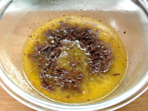 ![]() ③耐熱ボールにバターを入れ、レンジで2分ほど加熱し、完全に溶かします。 ④すぐに刻んだチョコを加え、3秒ほど置いてから、手早くかき混ぜてチョコを溶かしましょう。 |