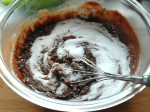 ![]() ⑤チョコが熱いうちに、砂糖を全量加え、ざらざら感がなくなるまで、しっかりと混ぜます。 |