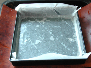 ![]() ⑩ケーキ型に薄く油(分量外)を塗り、オーブンシートを貼り付けます。 (シートの表が上に来るようにして下さい。) |