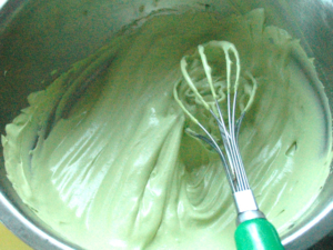 ![]() ③別のボールに、★印の材料を加えて泡立て、抹茶クリームを作ります。 (8分立てくらいの硬めのクリームを作って下さい。) |
