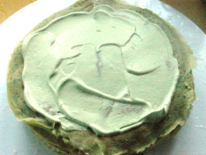 ![]() ④クレープ生地を一枚取り、平らになるように、抹茶クリームを塗ります。 |