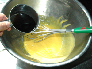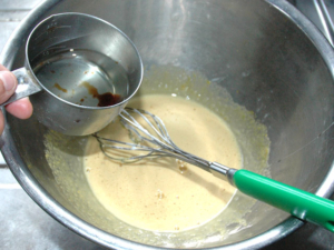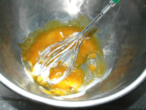 ![]() ③卵黄のボールにカルーアを少しずつ加え、その都度良く混ぜます。 |