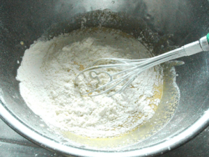 ![]() ⑤薄力粉とベーキングパウダーを混ぜたものをふるい入れ、泡立て器で粉っぽさがなくなるまで混ぜましょう。 |