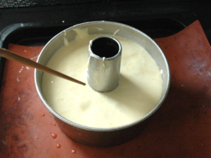 ![]() ⑦シフォンケーキ型に、少し上から生地を流し入れ、中央の筒部分を押さえて、トントンと落とし、大きな気泡を取り除きます。 ⑧出来たら、箸などで、型の内側をくるくると一周させ、中の気泡も取り除いておきましょう。 |