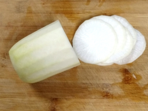 ![]() ①大根は皮をむき、薄い輪切りにします。 |