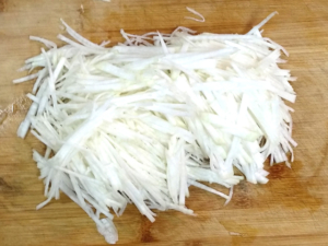 ![]() ②輪切りの大根を、今度は千切りにします。 |