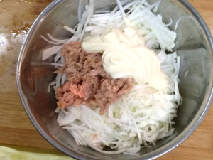 ![]() ⑤ボールに大根、ツナ、マヨネーズを加え、しっかりと混ぜ合わせます。 (野菜から水分が出るので、食べる直前に和えてください。) |