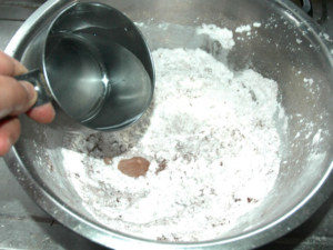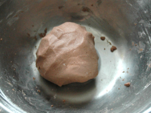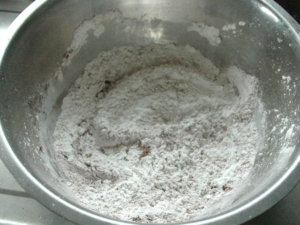![]() ①白玉粉と上新粉、砂糖、ココアをボールに入れ、良く混ぜておきます。 |