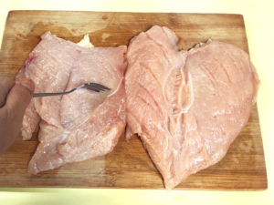 ![]() ①鶏むね肉は厚みを半分にして観音開きにし、フォークで身に穴をあけて、火の通りをよくします。 |