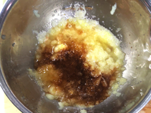 ![]() ②ボールに、玉ねぎをすりおろしたものと醤油、みりん、酢を入れ、よく混ぜ合わせてソースを作りましょう。 |