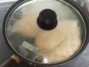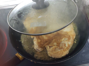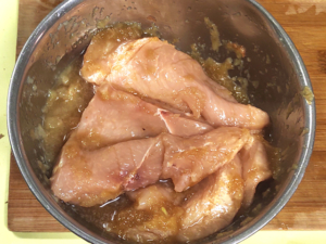 鶏むね肉があったので、玉ねぎソースに漬け込んで柔らかく調理してみました。ソースも美味しいと好評で、さっぱりといただけます。蓋をして蒸し焼きにで火を通します。
