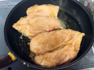 ![]() ④15分経ったら、フライパンに薄く油(分量外)を引き、鶏肉を皮目から焼きます。 ⑤中火で焼き、焼き色がついたらOK。 |