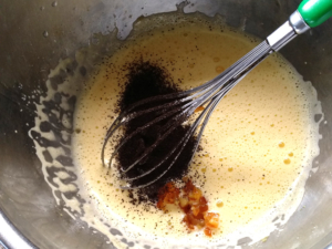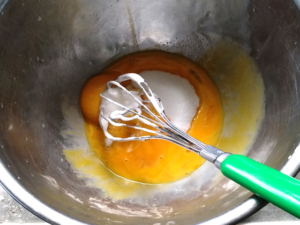②卵黄のボールに砂糖を加えて泡立て、白っぽくとろりとするまで泡だてます。
