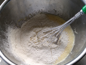 ⑥薄力粉とベーキングパウダーを合わせてふるい入れ、粉っぽさが消えるまで良く混ぜ合わせましょう。