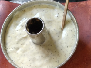 ⑨箸をケーキ内で、くるくる回しながら一周させ、中の気泡も取り除きましょう。