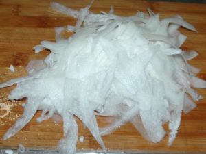 ![]() ④ピーラーを使い、大根をひらひらの薄切りにします。 |