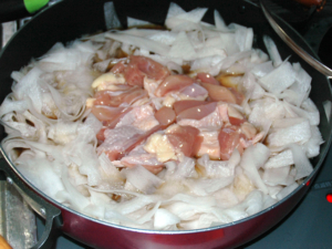 ![]() ⑤鍋の中央に肉を入れ、周りを大根で敷き詰めたら、蓋をして、15分ほど煮ましょう。 |
