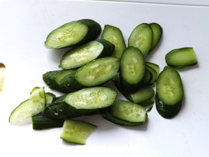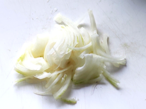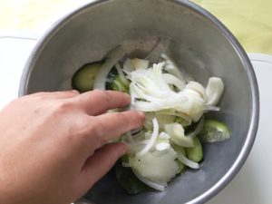 ③ボールに玉ねぎ、きゅうり、塩小1/4(分量外)を入れて手でもみこみ、そのまま5分ほど置きましょう。