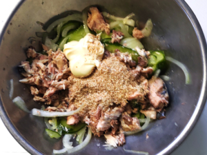 ④きゅうりがしんなりしたら、鯖缶をほぐしたものと、ゴマ、マヨネーズ、寿司酢をボールに加えてよく混ぜます。