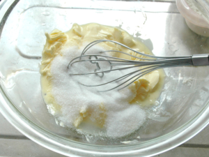 ![]() ①耐熱ボールにバターを入れ、レンジで10~20秒加熱して、マヨネーズ状になったら砂糖を加え、ザラザラ感が消えるまで混ぜます。 |