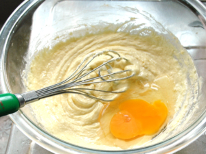 ![]() ②バターが白っぽくなったら、卵を一個割り入れよく混ぜます。 |
