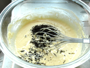 ![]() ⑤紅茶の粉末を加え、全体に散るように混ぜます。 (今回は白桃とアールグレイティーを使いました。) |