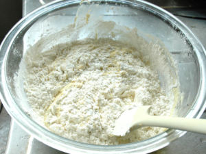 ![]() ⑥薄力粉、強力粉、BPを一緒にふるい入れ、ゴムベラに持ち替えてさっくりと混ぜましょう。 |