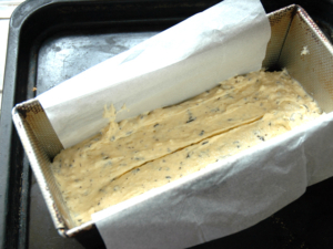 ![]() ⑦パウンドケーキ型にオーブンシートを油で貼り付け、生地をすくい入れたら、中央に縦に筋をつけます。 |