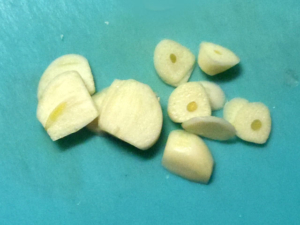 ![]() ①にんにくは、皮をむいて薄切りにします。 |