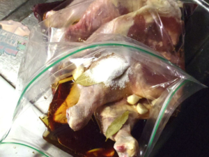 ![]() ③ZIPロックの袋に、鶏肉、にんにく、赤ワイン、オリーブオイル、ローリエを入れ、蓋をしてから、何度か揺すります。 ④そのまま一晩漬け込み、時々揉み返します。 |