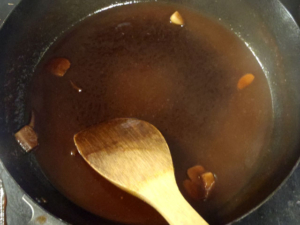![]() ⑦漬け汁をフライパンにあけ、ケチャップとウスターソース、砂糖を加え、中火で混ぜながら煮詰めます。 ⑧若干とろみがついたら、ソースの完成です。 |