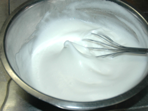![]() ①卵白のボールに砂糖をひとつまみ加えて泡立て始め、クリーム状の硬さになったら、二回に分けて砂糖を加えて泡立て、ピンと角が立つまで泡立てます。 |