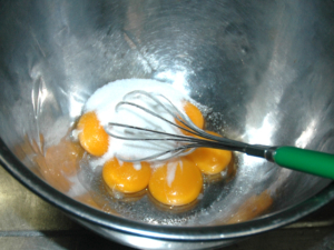 ![]() ②卵黄のボールに残りの砂糖の全量を加え、白っぽく持ったりとして、少し跡がつくまでしっかりと泡立てましょう。 |