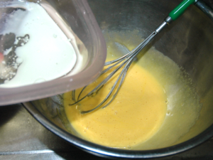 ![]() ③牛乳と油の混合液をレンジで20秒ほど加熱し、人肌になったら、卵黄のボールに少しずつ加え、その都度良く混ぜます。 |