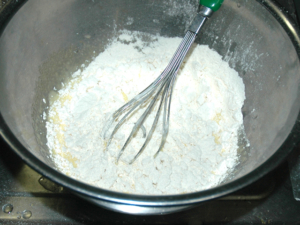 ![]() ⑤卵黄のボールに薄力粉ふるい入れ、粉っぽさがなくなるまで混ぜましょう。 |