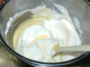 ![]() ⑥卵黄のボールの中身を全て卵白のボールに移し、ゴムべらに持ち替えて、さっくりと練らないように混ぜます。 |