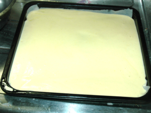 ![]() ⑦天板に薄く油を塗って、オーブンシートを敷いたら、生地を流し入れ、平らにならします。 ⑧上からトントン落として大きな気泡を取り除きましょう。 |