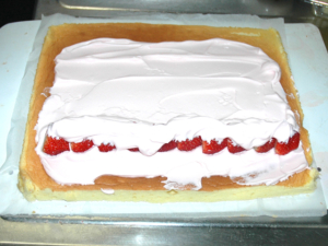 ![]() ⑬端を斜めに切り落としてから、クリームを塗り広げます。 ⑭手前に多めにクリームを塗り、切った苺を並べ、苺の上にもクリームを乗せましょう。 |