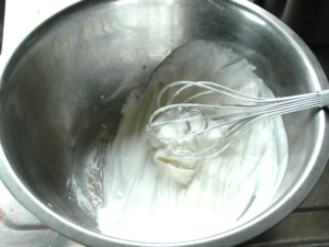 ![]() ①生クリームとクリーム用砂糖は泡立てて、9分立てくらいの絞れる固さのクリームにします。 |