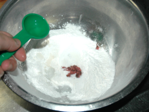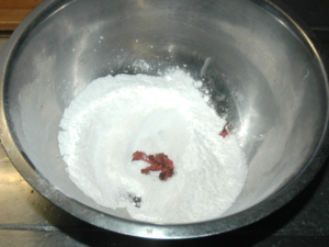 ①ボールに白玉粉、上新粉、砂糖、桜の花の塩漬けを刻んだものを入れて、軽く混ぜ合わせます。