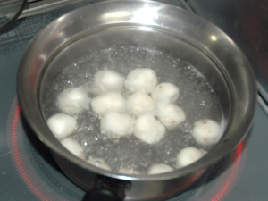 ⑤お湯が沸いたら、白玉団子を投入し、茹で始め、浮いてきたら、更に3分程ゆでましょう。