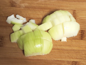 ![]() ②玉ねぎは皮をむき、粗みじん切りにします。 |